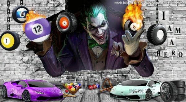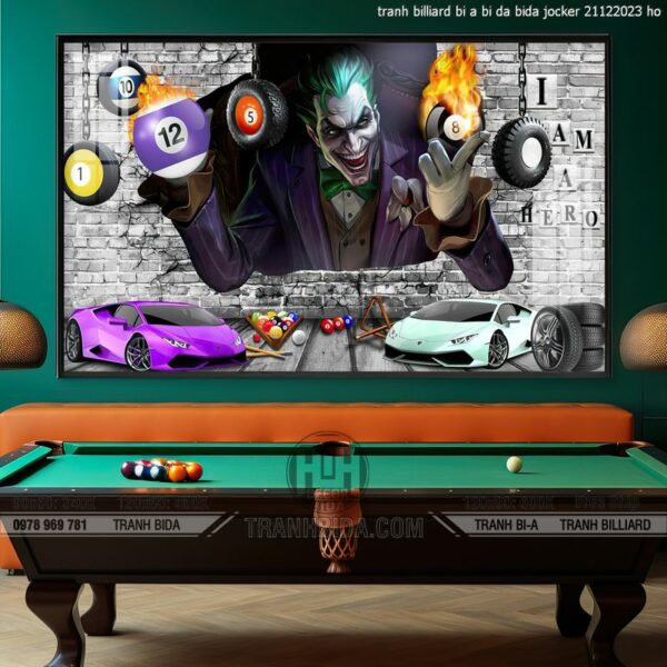Tranh BIDA, BILLIARDS chủ đề bida và nhân vật Joker thiết kế kết hợp giữa hai yếu tố này một cách sáng tạo treo tranh trên tường chính để tạo điểm nhấn mạnh mẽ có độ bóng và phản chiếu cao, giúp không gian trở nên sang trọng và hiện đại