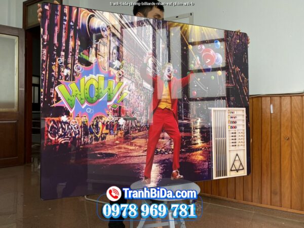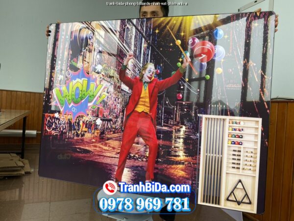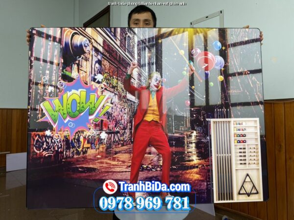 Tranh BIDA, BILLIARDS chủ đề bida và nhân vật Joker thiết kế kết hợp giữa hai yếu tố này một cách sáng tạo treo tranh trên tường chính để tạo điểm nhấn mạnh mẽ có độ bóng và phản chiếu cao, giúp không gian trở nên sang trọng và hiện đại