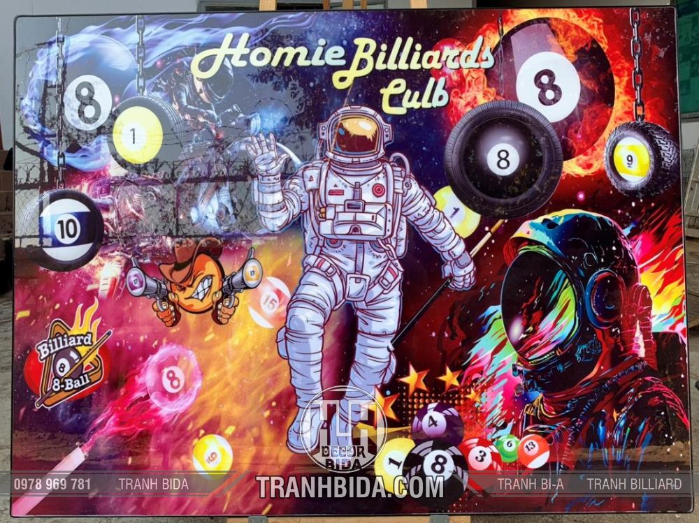 Tranh trang trí Phòng BIDA Phi Hành Gia sáng tạo và độc đáo, thường được thiết kế để mang lại cảm giác hiện đại, huyền bí và thú vị cho không gian chơi bida